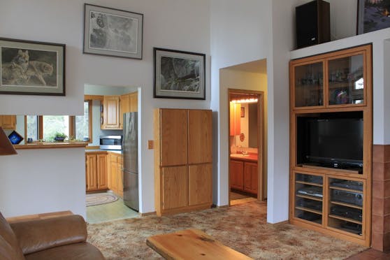 The Skyline Studio is a large 1 bedroom, 1 bath studio with a small livingroom area and TV with a private entrance on the main level of the Skyline House next to the garage. A coffee maker is provided but there is no kitchen. A garage bay is also included to park your vehicle or store your fishing gear and coolers.